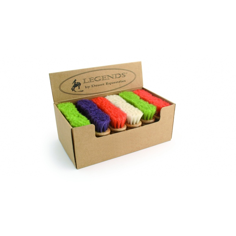 From the Legends Series this brush counter display contains 12 assorted. Each brush is made with a kiln-dried, double-lacquered, peanut-shaped hardwood brush block. Some come with the softest white goat hair or natural Palomino grey soft horsehair and the rest are made with raspberry pink or saffron yellow dyed soft horsehair. The brush head is only about 4 long and the size and shape make it easy for anyone to handle. The ultra-soft goat hairs are bleached white and measure about 1 long, making it perfect for grooming around sensitive areas, including around the eyes and nose. The horsehair bristles are just a little bit stiffer adding more uses for them. Not only are they good for finish grooming, but they can also be used to dust off your hat and boots, as well.