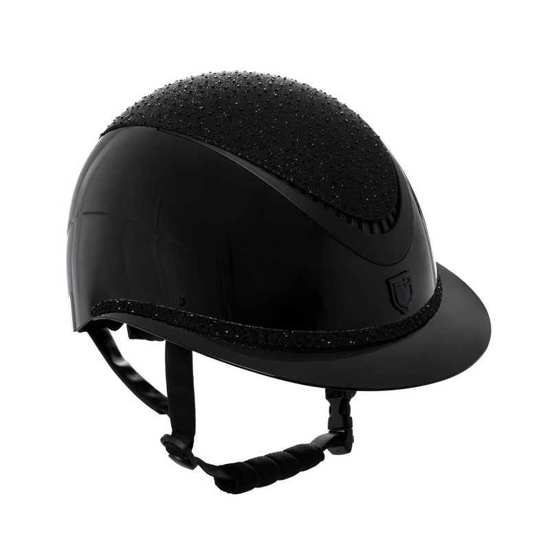 Equestro Luxury Riding Helmet with Rhinestones and Wide Visor - this glamorous equestrian helmet features an elegant rhinestone details as well as a glossy black frame that give it a striking look. The chic wide visor not only adds to the style of the helm