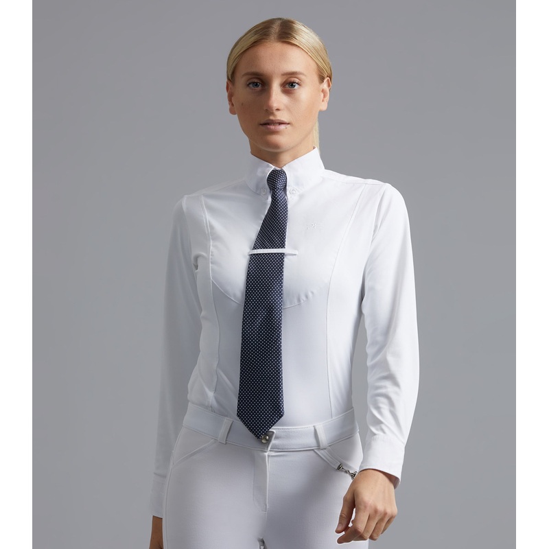 Edged buttons with a subtle etched branding add a polished, luxury look to this riding shirt. Designed to be worn with a tie and featuring a tie tuck to hold the tie perfectly in place. Holding buttons on the collar corners create a traditional equestrian look, perfect for showing and other riding activities.