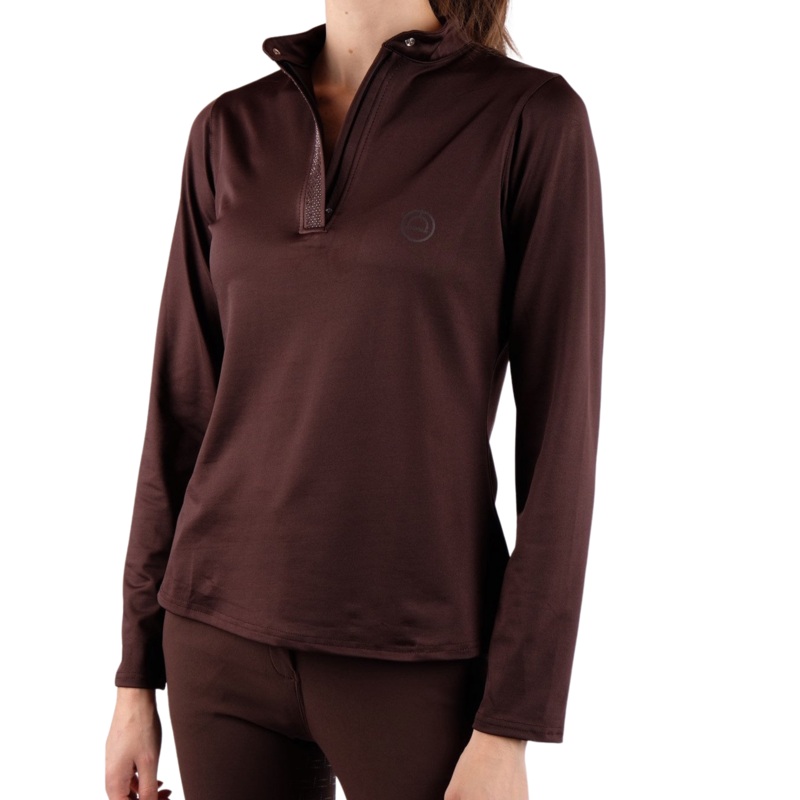 This Briella Crystal Shirt is a classic polo with black crystals with a neck zipper. The simple style means more space for your personality to spread out. The fabric has a smooth surface and is very comfortable. The highly functional fabric makes sure that the polo is sweat absorbent and breathable which ensures a comfortable feeling even when you work hard to achieve yours and your horses goals.