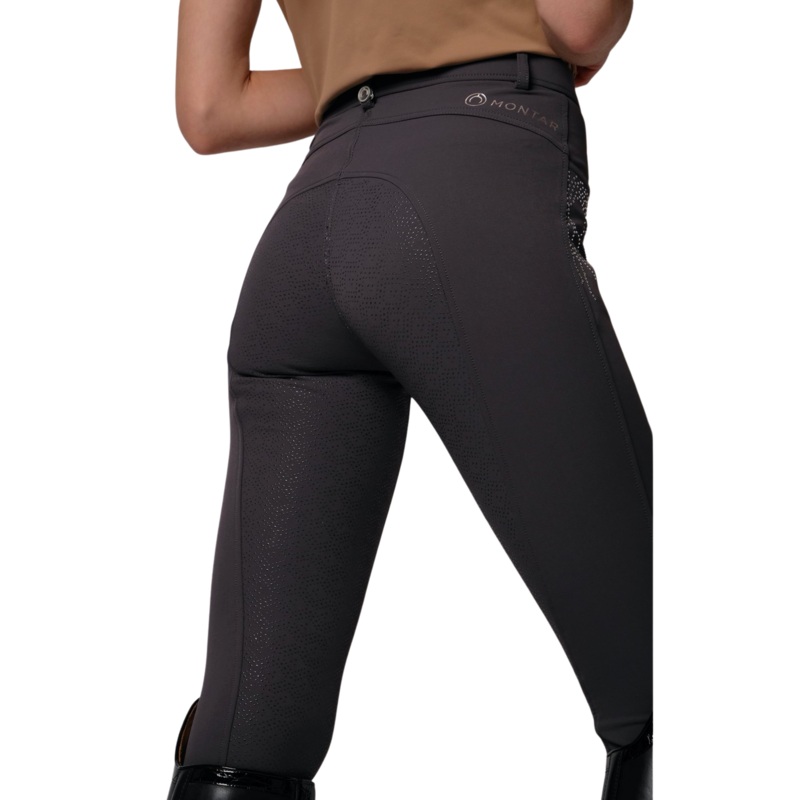 Normalwaist breeches with beautiful and thin clear crystal lians on the front pockets. Underneath the belt strap, on the right side in the back, is a shiny silver Montar logo. The silicone patterns are small dots in a detailed square pattern. Femke breeche