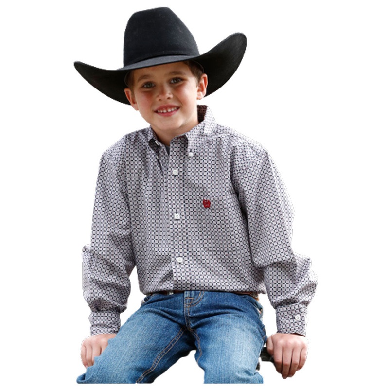 Cinch Boys Long Sleeve Buttondown Western Shirt - Navy, Red and Light Blue on a white background Multicolor PrintLong sleeveButton downCream colored buttonsOpen chest pocket with Red logo embroidery100% CottonColor: Multicolor print
