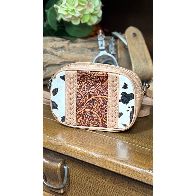 Made of PU leather, this crossbody has:Vintage floral tooledWhipstitch detailLeopard printDual zipper compartmentInside bag has a zippered pocket and 3 card slotsA zippered pocket on the backDetachable and adjustable crossbody strap8.2" x 2.75"x 6"Drop 24"