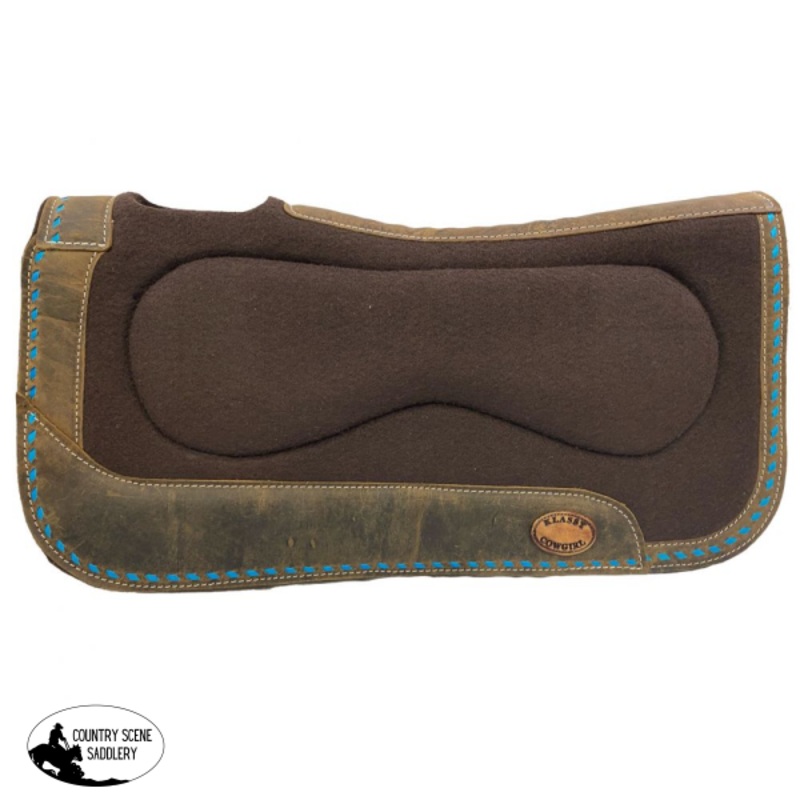Product ID: KC-3913DescriptionKlassy Cowgirl28x30 Barrel Style 1 Brown felt pad with teal lacing. This beautiful pad features a distressed brown leather with teal lacing. This saddle pad features a 1" heavy duty brown felt with vented wither and leather re