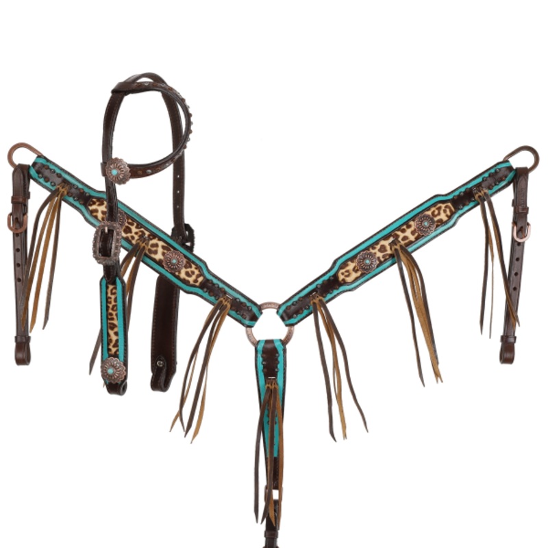 Product ID: 15011LChocolate and Teal Leather Base: Premium leather in rich chocolate and teal tones provides a durable, stylish foundation for the set.Cheetah Print Inlay: Bold cheetah print adds a wild, adventurous touch, contrasting beautifully with the