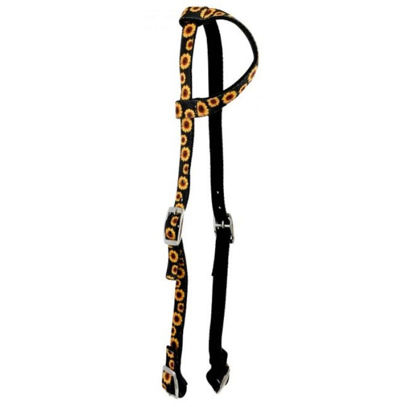 Nylon One Ear Headstall With Sunflower Design. This headstall is made of soft and durable premium 2 ply nylon material. Easily adjusts on both cheeks with nickel plated buckles and easy change bit loops. Will adjust approx. 15 to 19 (crown to cheek).var TabbedPanels1=new Spry.Widget.TabbedPanels(TabbedPanels1);