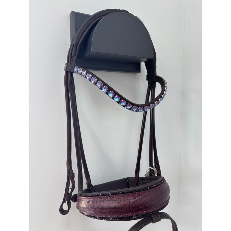 Otto Schumacher 'Feel Good' rolled Munchen Snaffle Bridle with Stainless steel hardware. Black with Greige padding. 6cm Comfort XS noseband in burgundy croco with fuchsia fineline piping. Browband is the stunning Rivoli 10mm XL tanzinite mix crystal browba