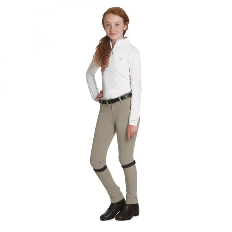 Great fit, comfy, mid weight cotton spandex melange fabric. Front jean styling makes this cute euroseat breech perfect for casual riding wear. With Syn-Tec Stretch Suede Knee Patches and cuff bottoms.