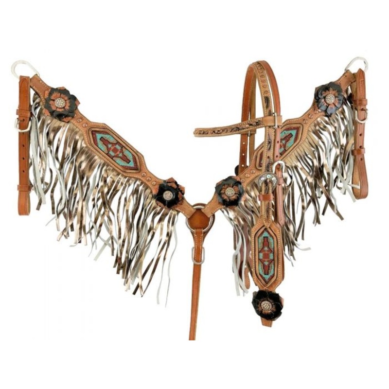 SF8009Showman Painted 3D Flower & Aztec Beaded Browband Headstall and Breast collar Set with Fringe.This set features a medium colored leather with hand painted brown 3D flowers with copper dots and a Aztecbeaded inlay. Breast collar has gold leather fring