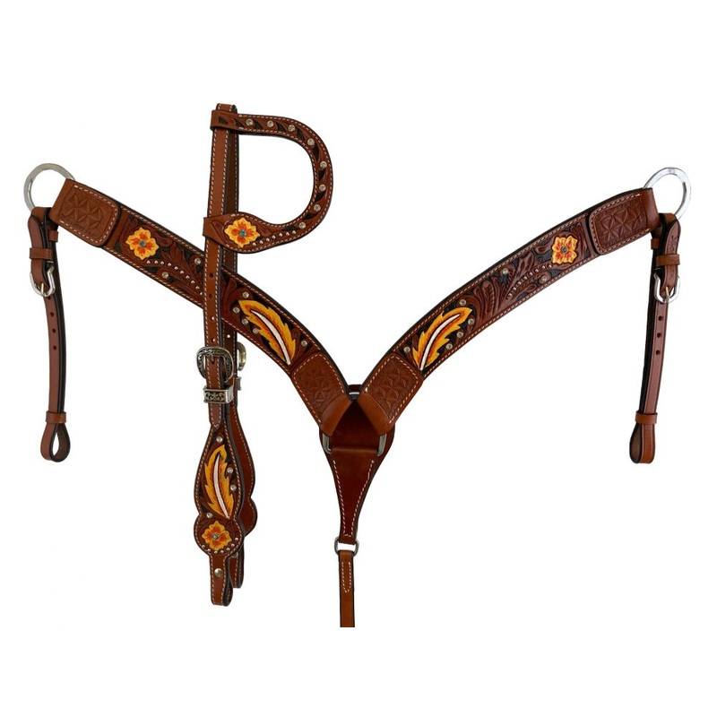 Painted Floral And Feather Design One Ear Bridle And Breast Collar Set-FREE SHIPPING