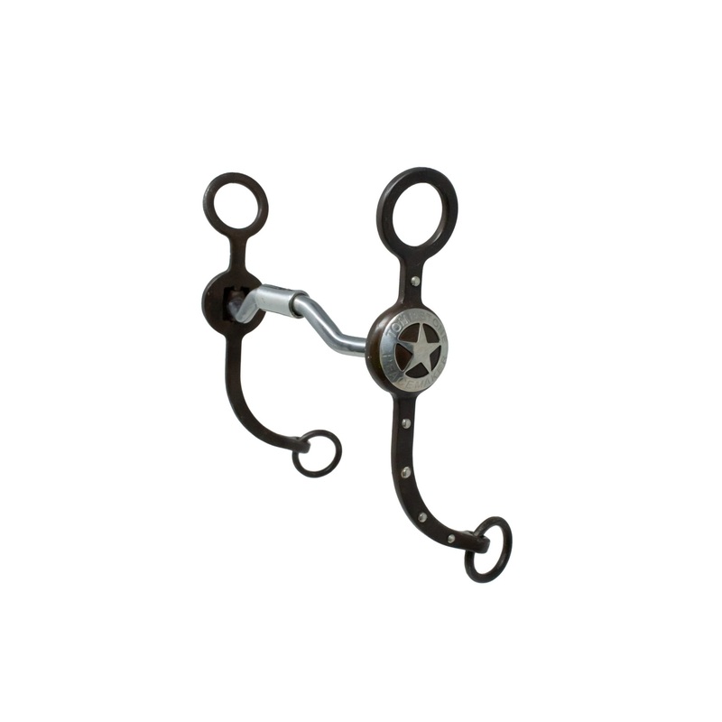 Features: Low port, hinged, sweet iron, curved, copper inlays7-1/2 med shankTombstone Peacemaker starSS dots, bottom loose ringSize: 5-1/8?Finish: AntiqueColor:AntiqueSize:5-1/8"