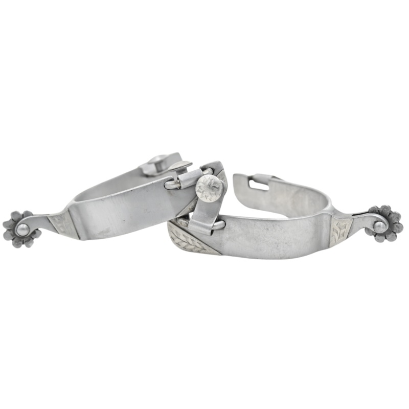 Partrade Large Roper SpurPartradeMen'sLevel TwoFinish: Raw SteelSilver Engraved OverlayCup Size: 8"Band Width: 1Shank Length: 1 1/4Rowel Points: 8Rowel Size: 1Sold In PairsThese Partrade Men's Spurs feature a raw steel finish, giving them a natural and rus