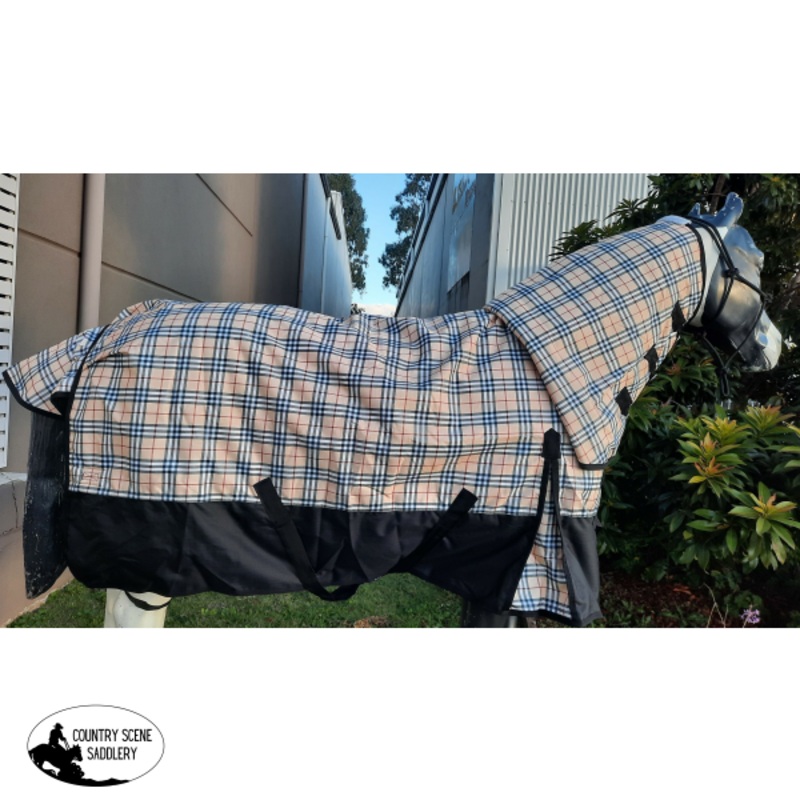 Stylish Tartan check 1200 denier waterproof outer with 200gram polyfill. Double webbing and buckle chest straps with Velcro closure. Double Belly Bands, Three straps on neck rug. Satin on wither, neck and shoulders. WITH DETACHABLE NECK RUG( Note Bulk orde