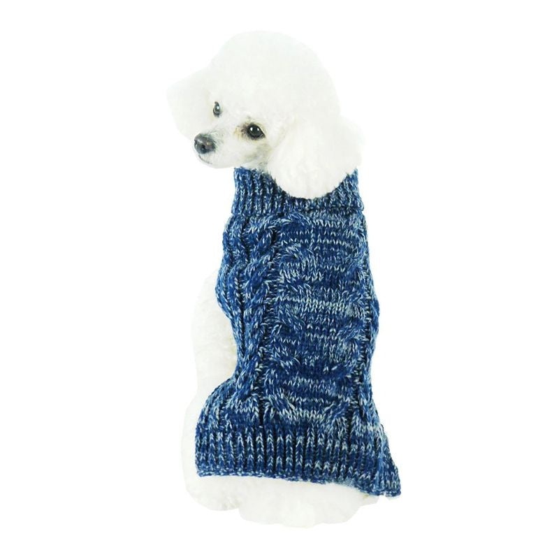Pet Life Classic True Blue Cable Dog Sweater The Classic True Blue Heavy Cable Knitted Ribbed Fashion Dog Sweater is composed of a plush, soft, cotton and acrylic blend. Featured on the back of this fashion sweater is a leash slit. This pet sweaterhas anultra cozy turtle neck along the top and a stylish weaved design along the back side. Keeps your dog warm and comfortablein those colder winter climates and warm during those chilly summer night strolls.