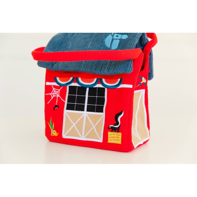 Carry your Piccoli pony or horse in style with this meticulously embroidered red barn bag, featuring a charming barn swallow, skunk, rooster and bumble bee to delight any equestrian enthusiast. Embroidered banners add retro flair to this classic yet unique design. The roof opens with hook-and-loop fabric, making it easy for little pony owners to tuck in and take out their beloved stuffie.