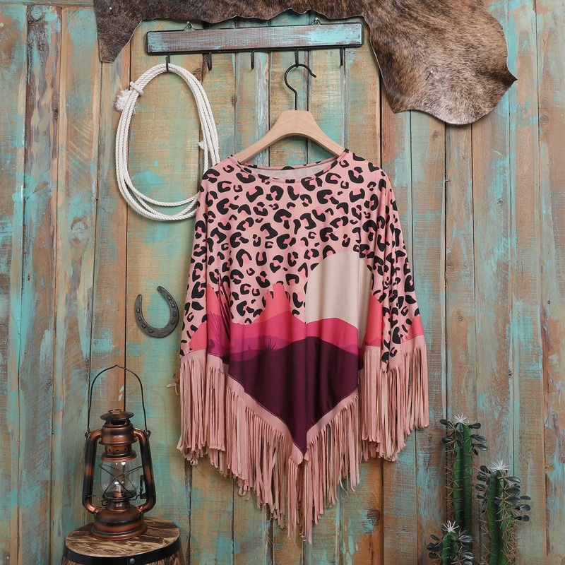 MONTANA WESTSFPCH-1731Fringe PonchoLeopard Dessert Sunset PrintSoft and comfortableOne size fit mostFull Length approximately 31"90% Polyester10% Spandex