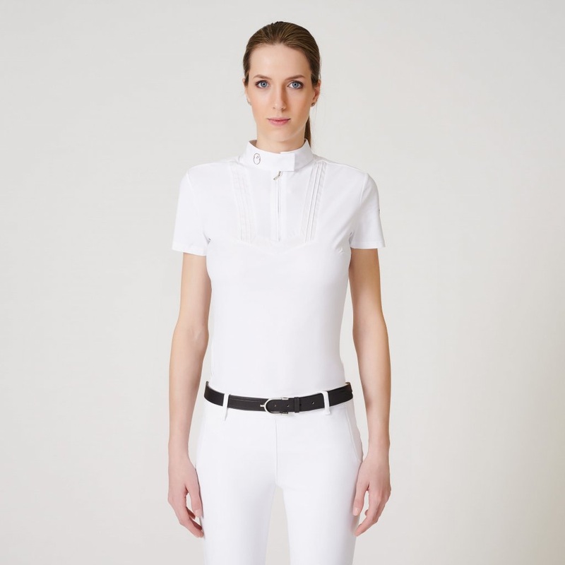 Introducing the VESTRUM Pisa Women’s Short Sleeve Competition Shirta perfect blend of technical prowess and timeless elegance. This highly advanced shirt features ribbing on the frontal bib, fastened by a stylish golden chain zip. The brand logo is tastefully printed in frames on the sleeve and also adorns the stand-up collar. An insert in contrasting colors adds a touch of visual interest on one side. The smooth texture of theCompetition Shirtnot only enhances the brightness of the colors but also ensures proper breathability for optimum comfort. Crafted from durable and strong materials, the Pisa Competition Shirt is designed to withstand the rigors of competitive riding while keeping you looking stylish and refined.