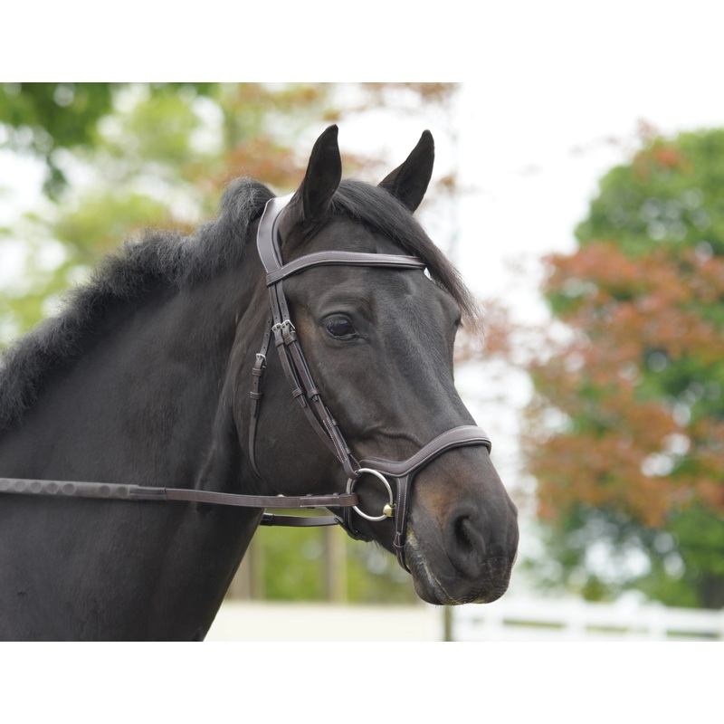 Research shows that horses with sensitive poles can benefit from this type of bridle that does not touch the top of the horses head. The area that rests behind the ears is well padded and raises the crown to reduce contact with the pole area. The hybrid noseband (a cross between a flash and figure 8) has a unique softly padded flash strap, and comfortable chin pad. The new rubber reins have an indentation placed strategically along the length of the rubber to provide a nice soft imprint to place the thumb. ** USEF rules prohibit this style for competition, but this bridle make a nice addition to your tack room to allow your horses to train in comfort.
