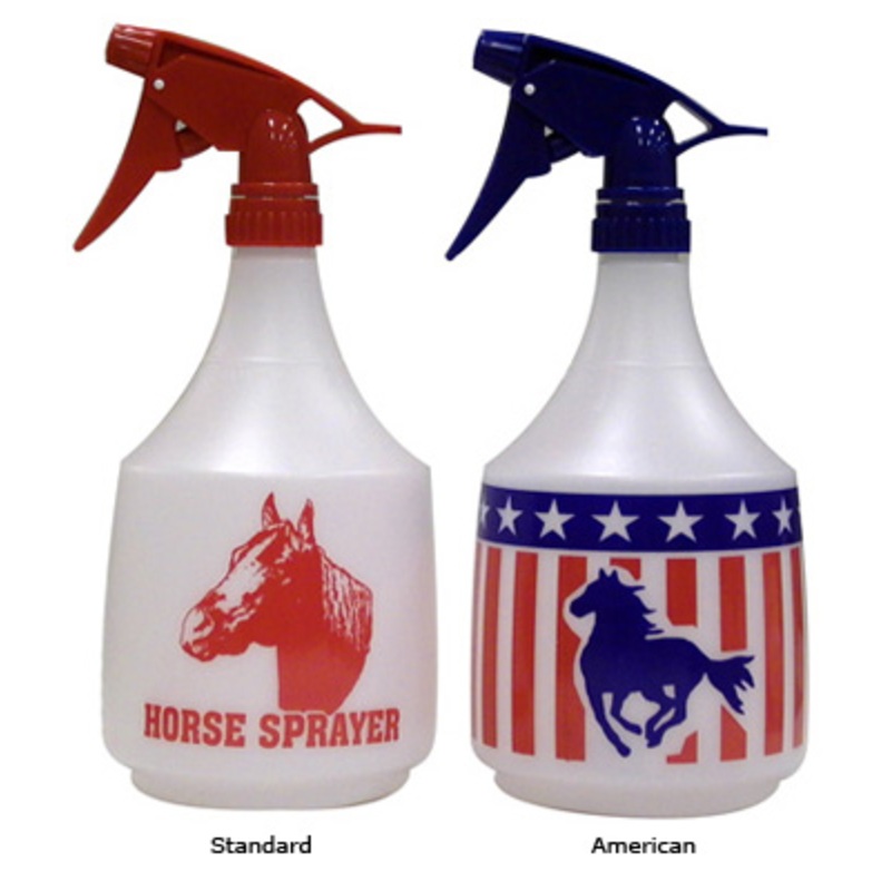 36 oz poly spray bottle with standard horse (assorted colors) or American Pride horse (red and blue) imprint.