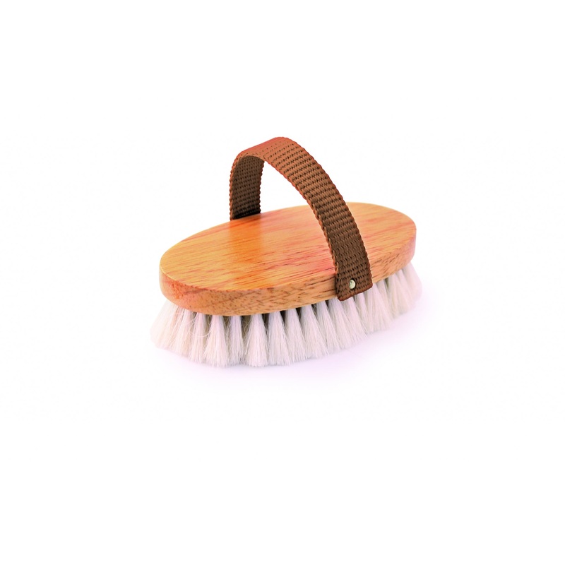 Kiln-dried, double-lacquered hardwood oval brush block with soft white goat hair. Designed for a child's hand, our oval pig grooming brush has a foldable tan web strap that bends to fit neatly into a back pocket: perfect for last minute pre-show touch-ups!