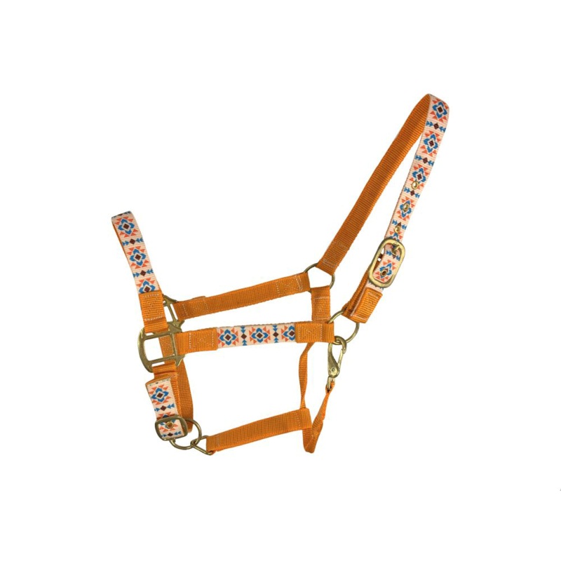 Premium Nylon Horse Sized Halter with Orange Southwestern Print. Comes equipped with heavy duty brass plated hardware and a heavy duty snap throat latch. Easily adjusts at crown and nose.AVERAGE HORSE SIZE 800-1100LBSvar TabbedPanels1=new Spry.Widget.TabbedPanels(TabbedPanels1);