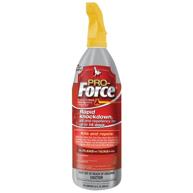 Rapid knockdown kill and repellency for up to 14 daysFor use on ponies horses dogs and for use as a premise sprayKills and repels 14 insects and west nileKills fleas and ticks on dogPro-Force Rapid Knockdown Fly Spray is available in 32 oz spray and gallon