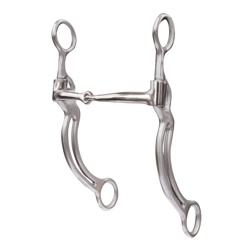 The double bar offset swept back 8 cheek has great balance, smooth leverage application and quick release. The snaffle is made of 3/8 sweet iron material. The slight bow in the mouthpiece allows for more comfort at rest and a good feel on the pull.