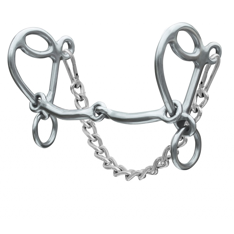 A short shank gag with loose rein ring. The compact cheek functions similar to a ring bit but allows use of a curb chain to increase collection and bend. Smooth, two-piece snaffle has a slight curve to the bars allowing the bit to rest comfortably across y