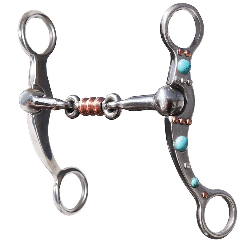 This weighted cheek allows for more control and added poll pressure while maintaining clean lateral movement. The cheek pieces are polished steel with decorative silver and turquoise designs. Dog bone mouthpiece.Mouth: 5 1/4″ Cheek: 6″NOTE: These bits will rust when exposed to moisture. This creates a sweet taste in the horses mouth and promotes salivation.