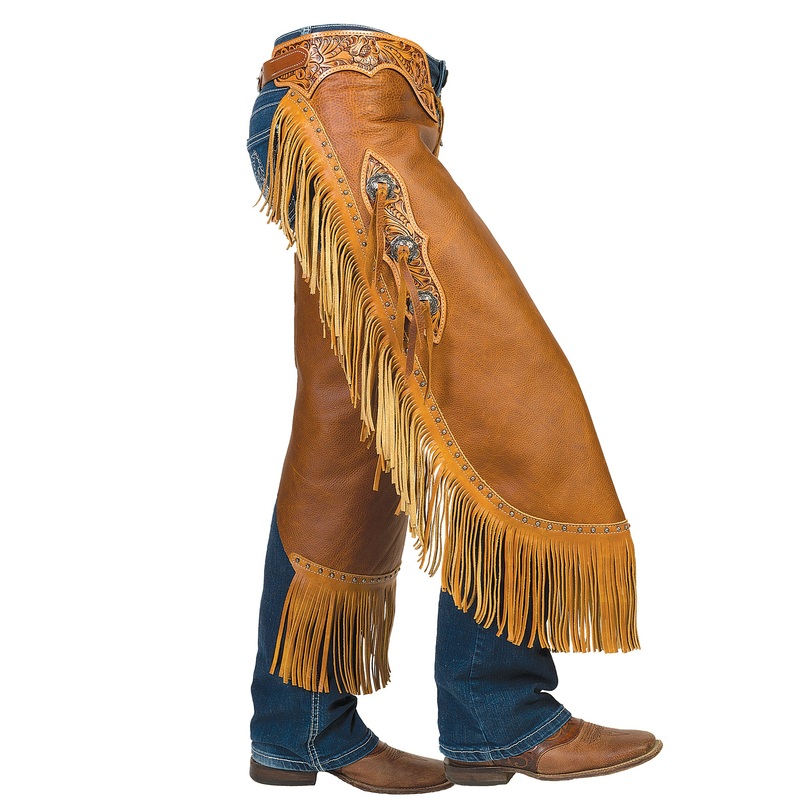 High end fashion styling sets these chinks apart from the rest! Handcrafted from chrome tanned pull-up leather in rich golden tones, these chinks feature details that turn heads including floral tooled yoke and scallop set, floral conchos with black accents, and sewn-on contrasting fringe outlined with antique silver umbrella spots. Designed for added freedom of movement, they feature adjustable leg straps, back buckle closures and front tie closures to keep these chinks in place.