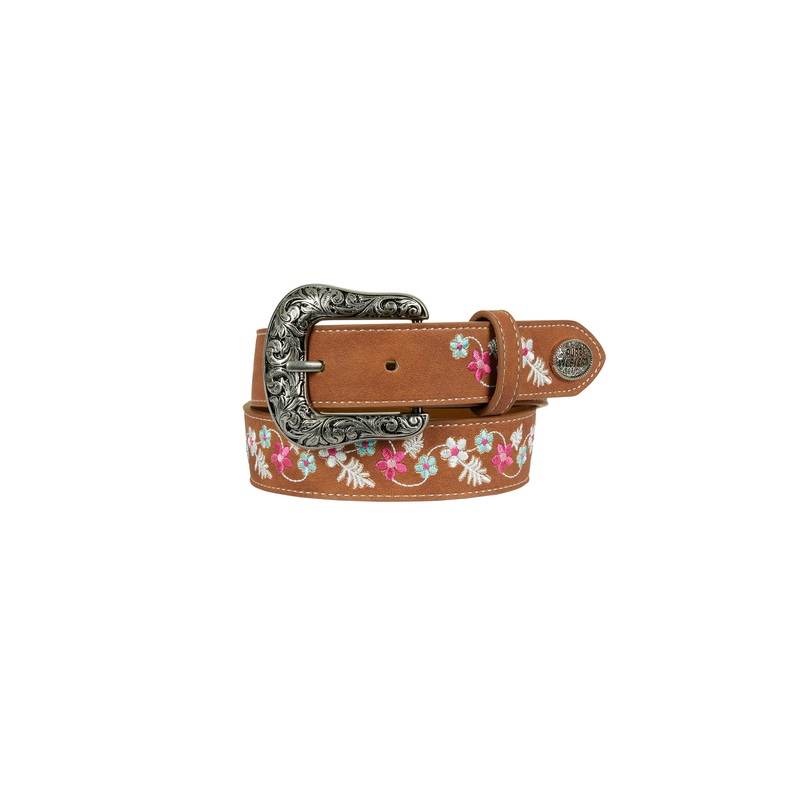 This product features exquisite floral embroidery, a classic Pure Western concho, and high-quality antique silver hardware, all in a classic tan color.