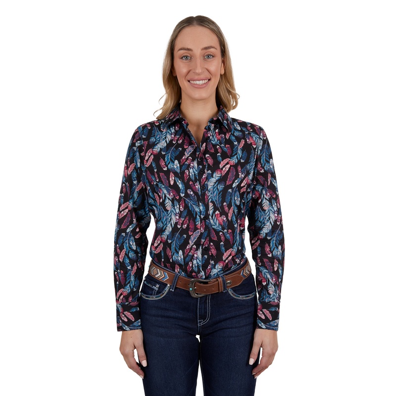 Classic button through long sleeve shirt, button closure, extra button at bust, Pure Western logo pip on side seam, light weight fabric with soft handfeel