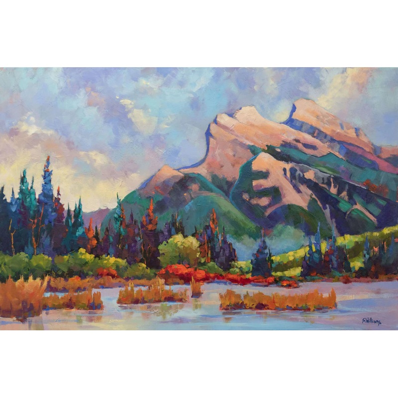 Waskahigan Watchi (house mountain in Cree, and also known as Rundle Mountain) serves as the striking backdrop to Vermillion Lakes in this beautiful painting by Calgary artistSharon Lynn Williams.