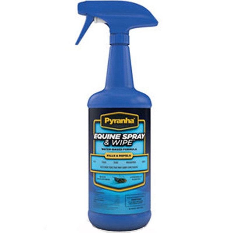 Pyranha Equine Spray & Wipeis a water-based formula that provides quick knockdown of flying insects, and won't attract dust or grime. Effective for up to 30 daysReady-to-useNon-greasy formula contains 0.25% pyrethrins, 2.5% piperonyl butoxide, 0.50% permet