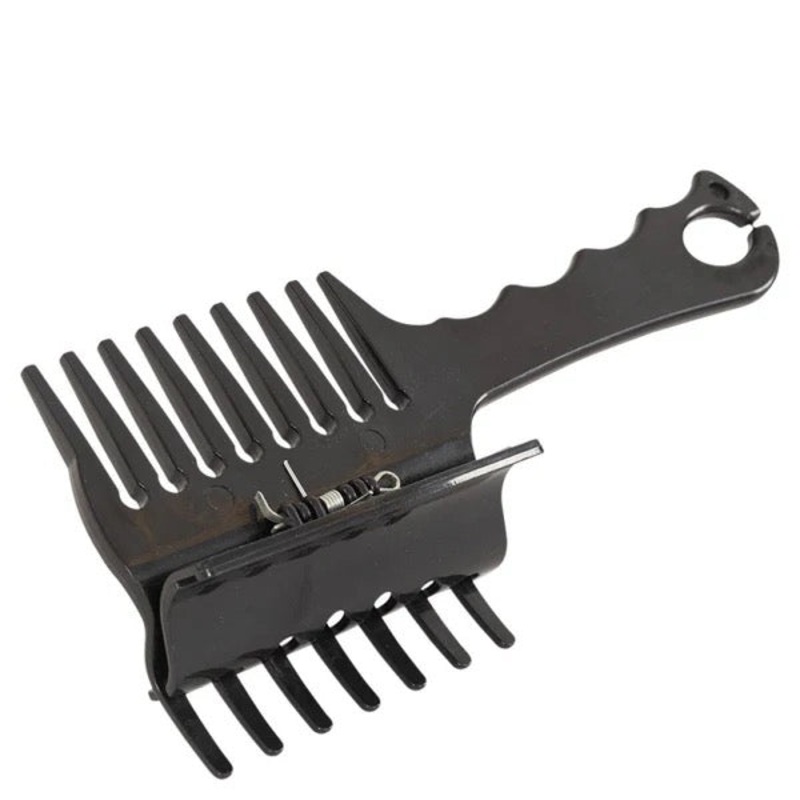 The mane comb with clip allows for tight braiding. The mane of your horse is secured with the clip and the comb ensures that you can make even sections. In the handle of the comb is an eye where you can hang your elastic bands.