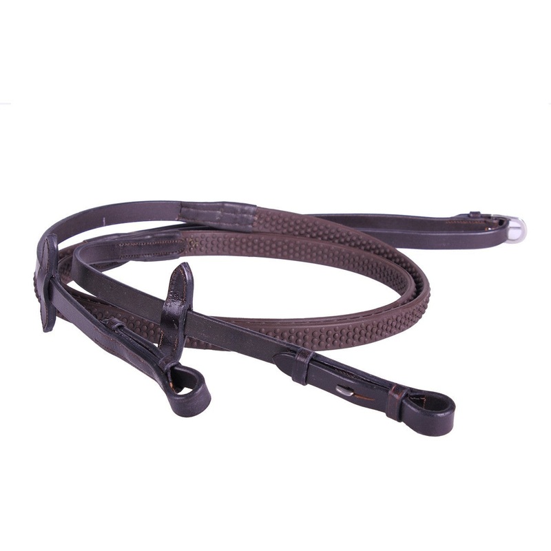 These reins are made of rubber with studs for good grip. Finished with leather, martingale stops and hook studs.