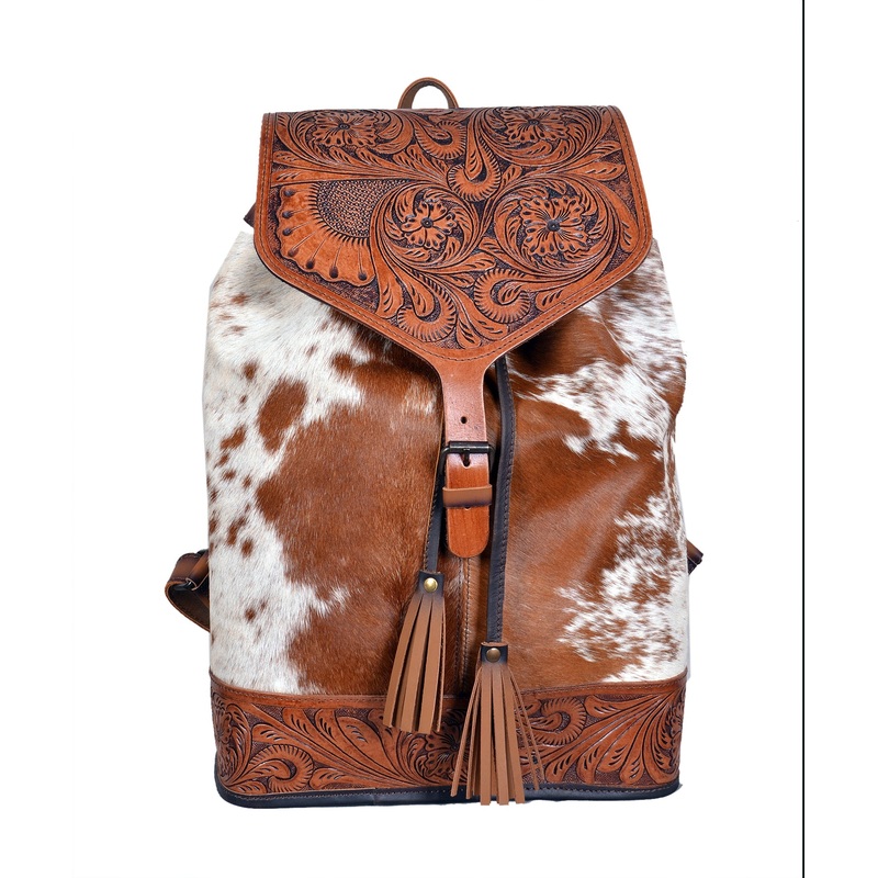 G-RTBL2800BNThis beautiful hair on hide tooled back pack is perfect for those short day trips or weekends. The classy style and exquisite craftmanship is sure to get you noticed.