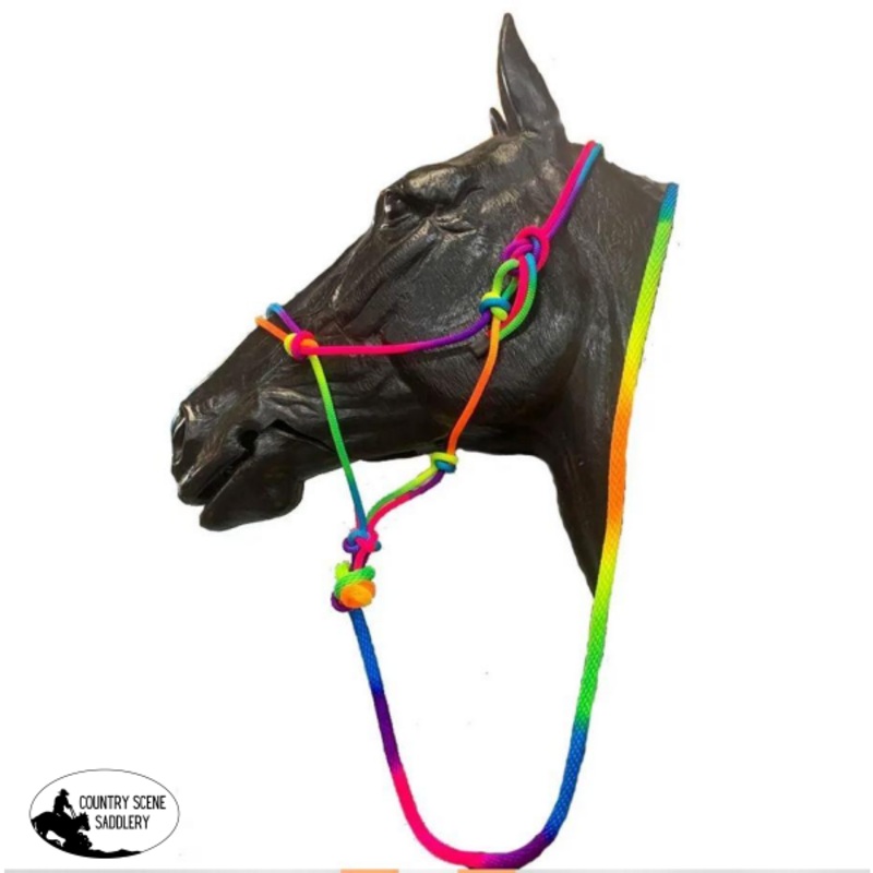 DescriptionHorse Rainbow Halter & Lead SetArrived In store are these always popular Rainbow Halter & Lead SetsSet Comprising ofKnotted Nylon Flexible Strong Halter& Matching Braided Round LeadBright Colourful Rainbow ColoursPony, Cob, Full Sizes
