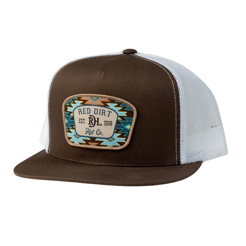 Red Dirt Hat Co. Aztec Jango Brown and White Mesh CapClassic Brown Flat Bill Snapback CapFun Aztec Red Dirt PatchWhite Mesh Back for breathabilityAdjustable Snap Back ensures a comfortable fitBrown Flat BillRed Dirt Hat Company, originating from Arp, Texas