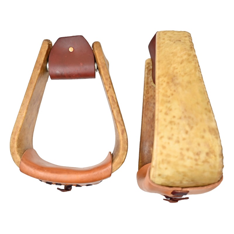 This stirrup is an oak metal bound core covered in natural flint rawhide and laced with rawhideleather treads.