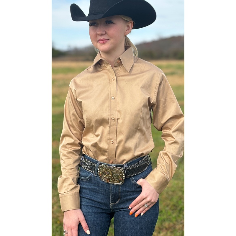 These shirts are a beautiful sateen cotton.Full front Button and on cuffs for clean look. Shirt is long enough to tuck it in or keep outside as fashion dictates. Princess seams contours to the body. Machine Washable in cold water, lay flat to dry for best results. Made by RHC.