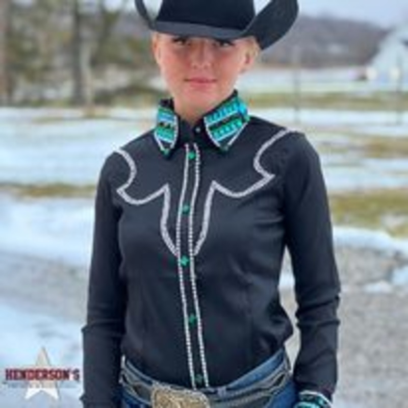 This shirt shimmers on its own. It is four way stretch taffeta. It has blinged stiff collar and cuffs to stay in place. Already dazzled up for your World Show.