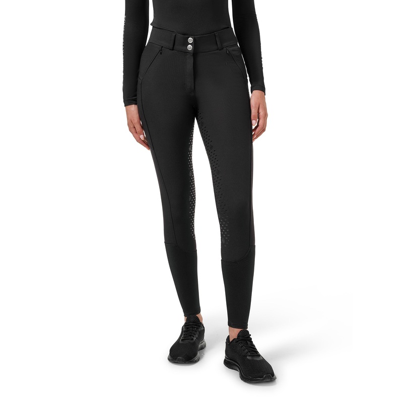 Classic black riding breeches with medium high waist. The breeches are created with 4-way stretch in a soft fabric for ultimate comfort and fit. Comes with four good-sized pockets, two with zippers and two pockets for mobile phones on the sides. The front is decorated with two crystal buttons. The silicon grip helps keep you steady in the saddle. Comes in a wider size range.