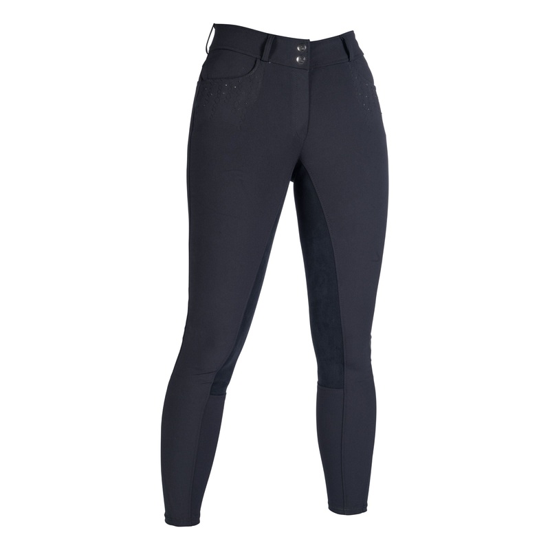 HKM Style Riding Breeches Savona Style with Alos Full Seat – ride in style and comfort with these classic women’s full seat breeches from HKM. Always popular with dressage riders thanks to their faux leather full set, the breeches feature elegant crystal decorations on the pockets and have a high-rise for ultimate comfort and a perfect fit. The bi-elastic fabric allows complete freedom of movement in the saddle and is dirt resistant to help keep you looking your best. Large belt loops allow you to wear your favorite belt when riding.