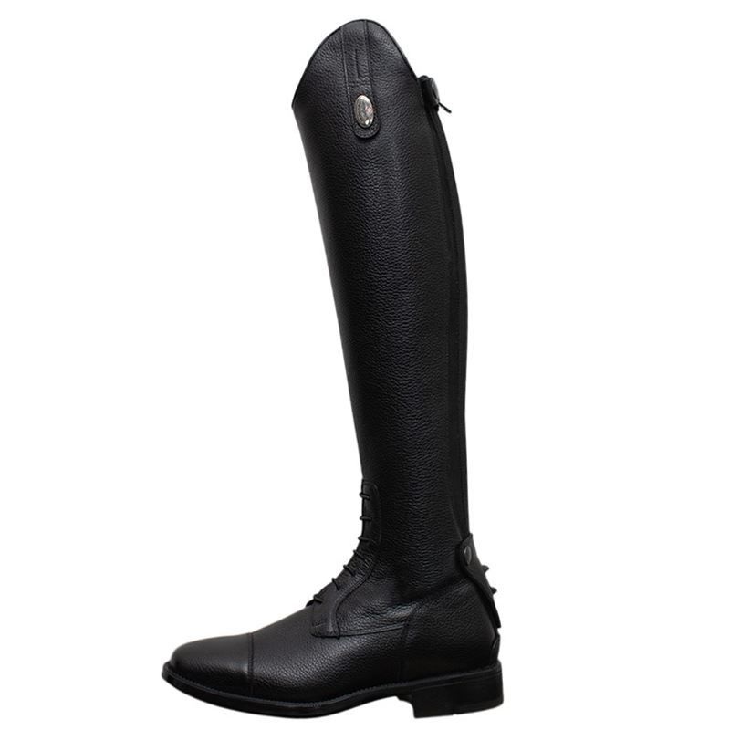 Deze versie is gemaakt in Quick zwart leder. Al het leder dat in de productie van deze rijlaarzen wordt gebruikt, is Italiaans kalfsleder. De zool van dit model bestaat uit meerdere lagen leder, waardoor deze erg comfortabel is. De gelijmde lederen zool wordt gemaakt in de kleur van de laars, wat zorgt voor een sportief uiterlijk. De Niro Tricolore paardrijlaarzen zijn bij Dokihorse in enkele maten en kleuren uit voorraad leverbaar. Andere maten kunnen via ons altijd worden besteld bij de officiele De Niro fabriek.