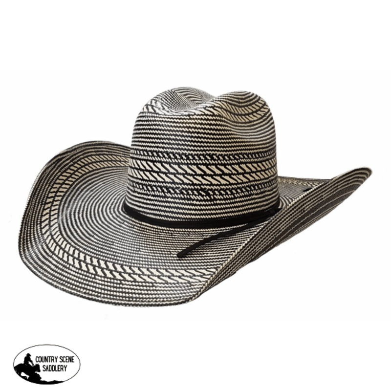 This straw hat from Rodeo King features a distinctive two tone black and white pattern.