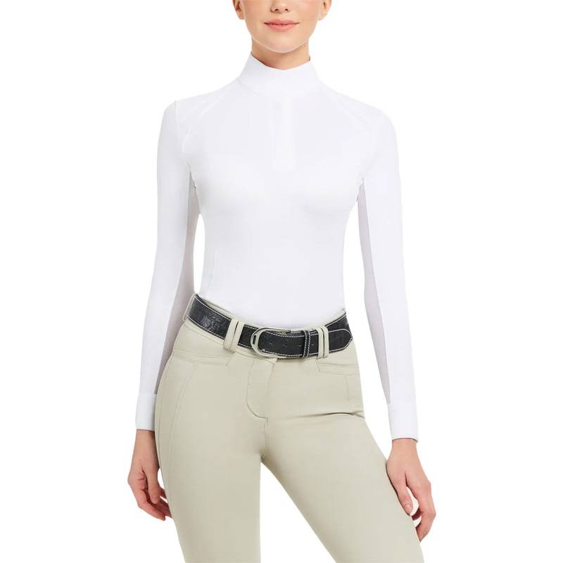 The Sofia long sleeve show shirt is a classic staple piece for every show clothing wardrobe. Modern seam lines, a zipper placket, and simple detailing make it the perfect choice for riders of all levels and styles. The wicking fabric also features UPF 30 s