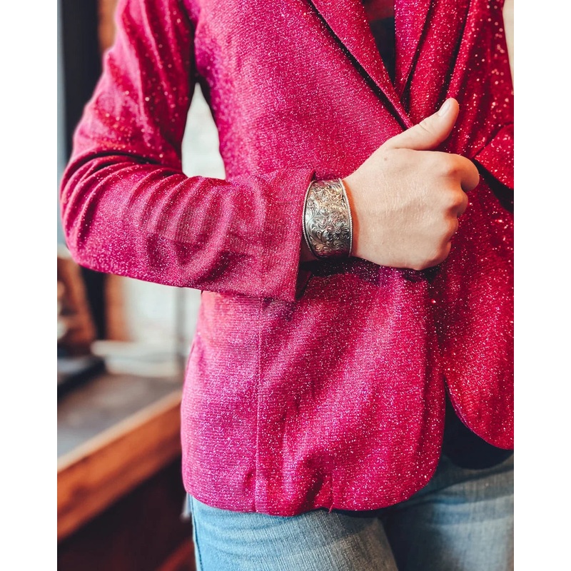Make a bold fashion statement with the Rock & Roll Denim Iridescent Western Blazer in hot pink! The iridescent finish adds a touch of glamour to any outfit, while the vibrant color is sure to turn heads wherever you go. This versatile blazer can be dressed up or down, making it a perfect addition to your wardrobe. Elevate your style game and rock this stunning blazer with confidence!
