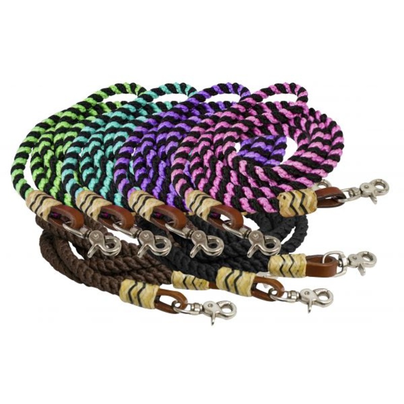 Showman 8FT rolled nylon barrel reins. These nylon reins features braided and rolled nylon with rawhide braided accents. Easily attach to bit with scissor snap ends.