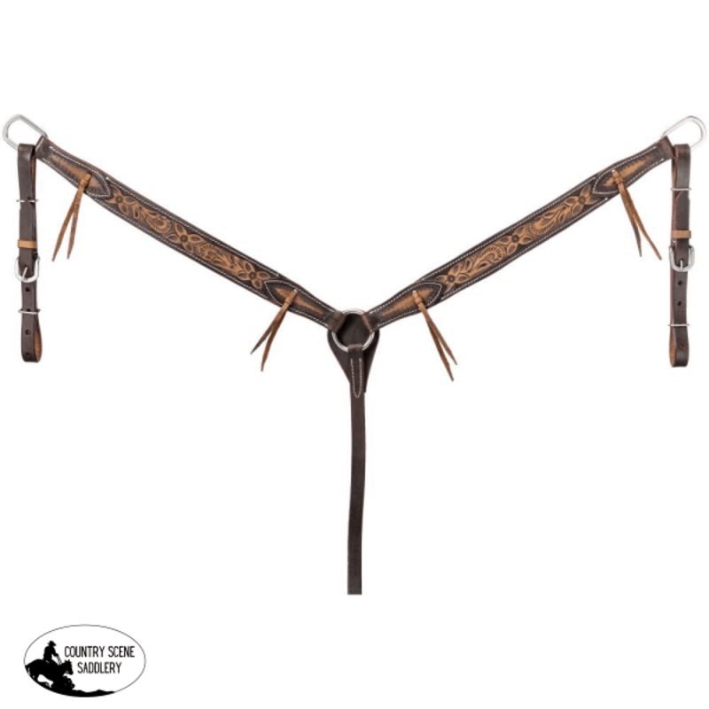 This western breastcollar is crafted from quality leather with a beautiful antiqued two-tone finish. The floral and leaf tooling designs and simple leather tassels give this tack piece an elegant western style. Includes adjustable tug straps. Stainless steel hardware.LeatherAntique two-tone finishFloral and leaf toolingCrisp white stitched edgeAdjustable tug strapsStainless steel hardware